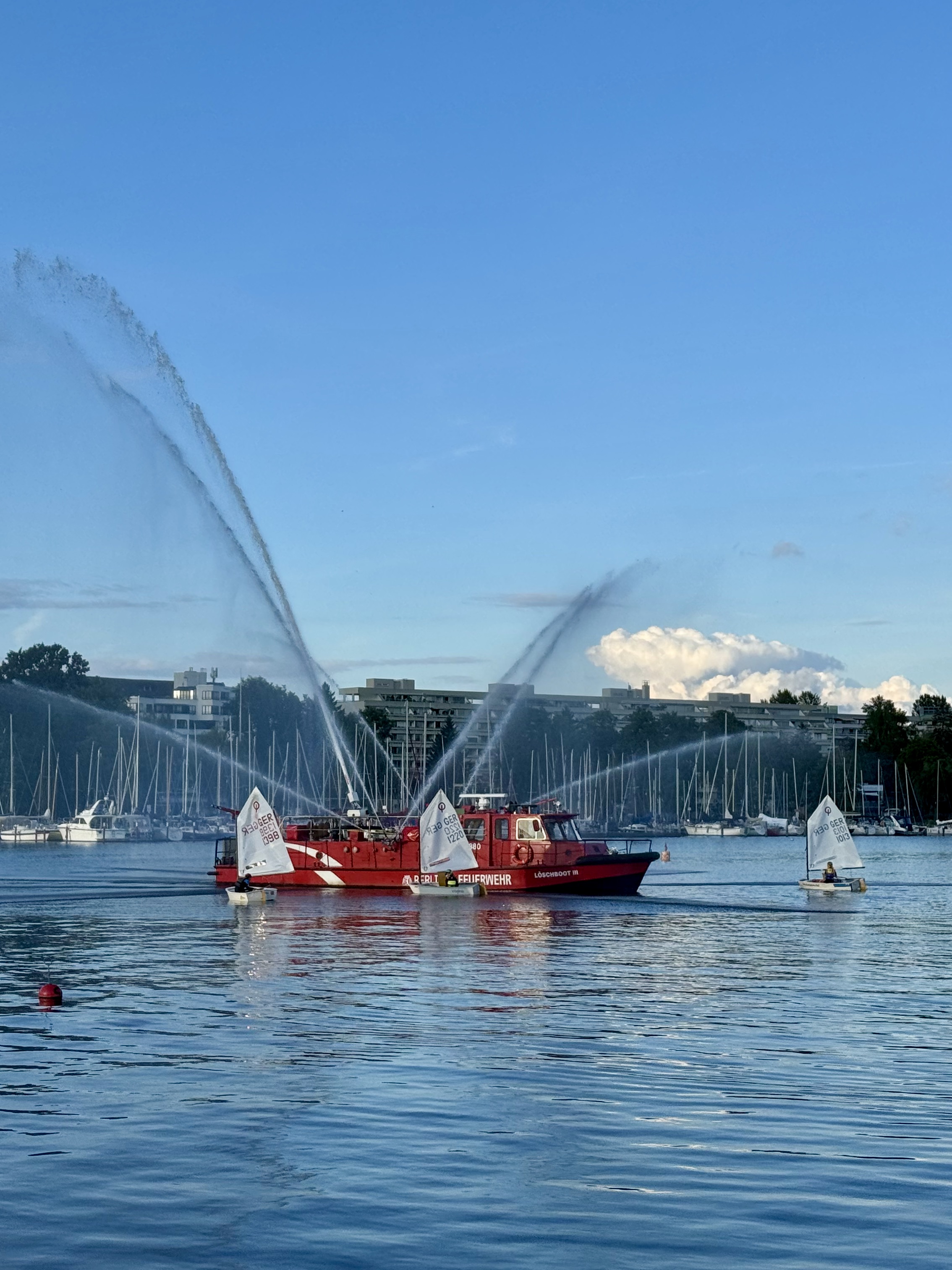Ganz besonders sehenswert war die Fontäne, die ein Löschboot der Berliner Feuerwehr vor unserem Hafen auf der Scharfen Lanke als herrlichen Festtagsgruß versprühte. Und mittendrin mit Clara, Lina und Otto drei unserer Opti-Seglerinnen und -Segler!