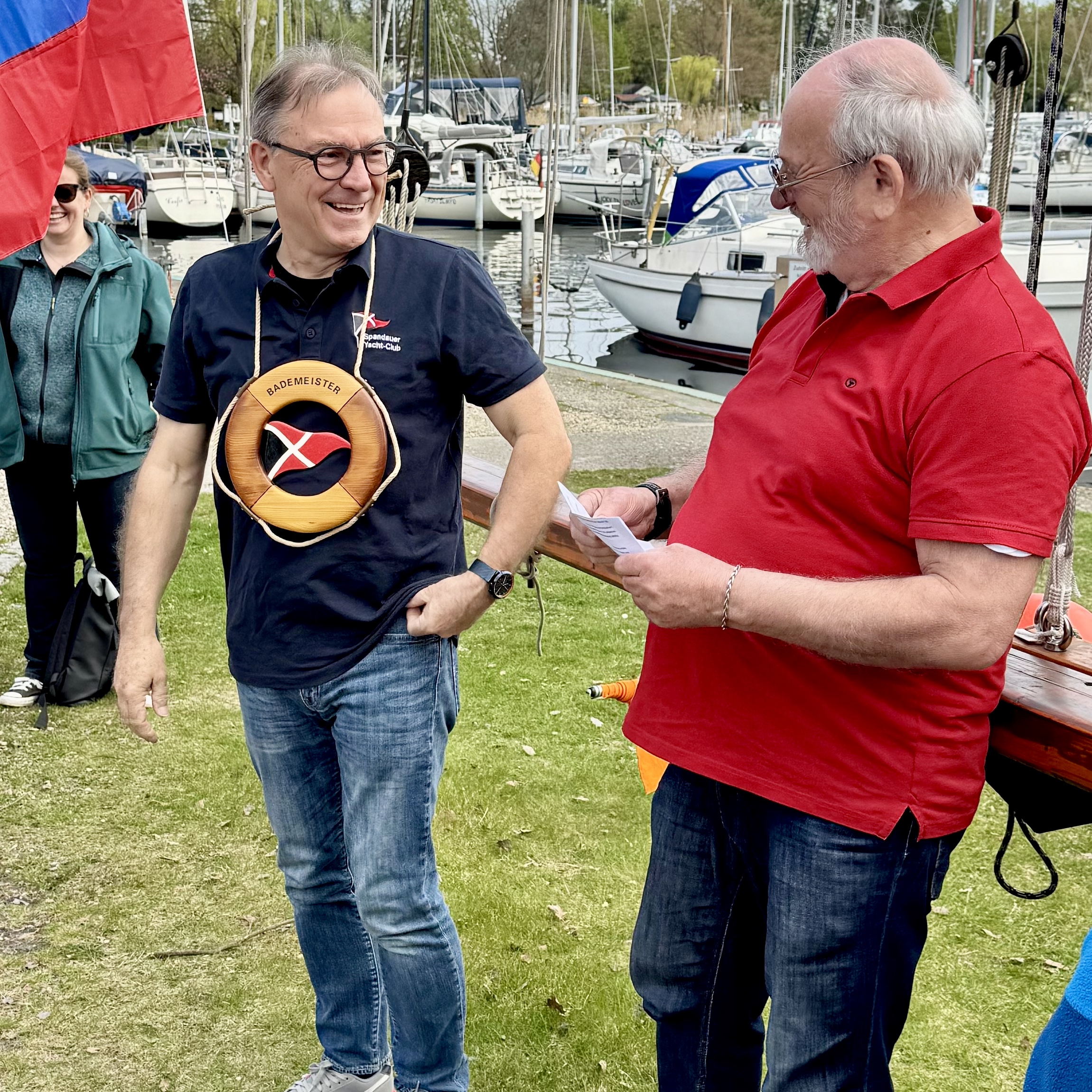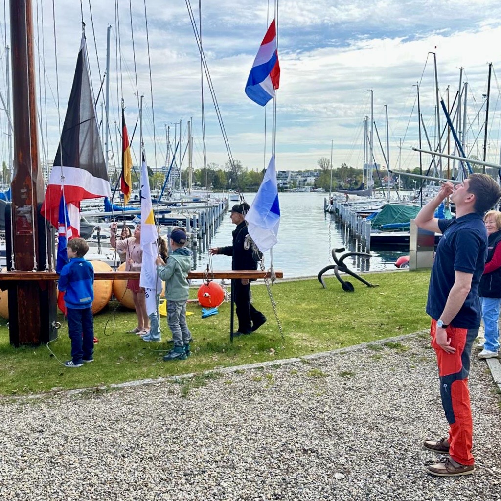 Am Flaggenmast war viel Tradition: Der Vorsitzende hielt seine Rede, die Segeljugend war dort, um die Nationale, den Clubstander und die Verbandswimpel zu hissen. Dazu wurde bei uns Seite gepfiffen. Auch kürten wir wieder einen Bademeister mit entsprechendem Orden: Herzlichen Glückwunsch, lieber Harald!