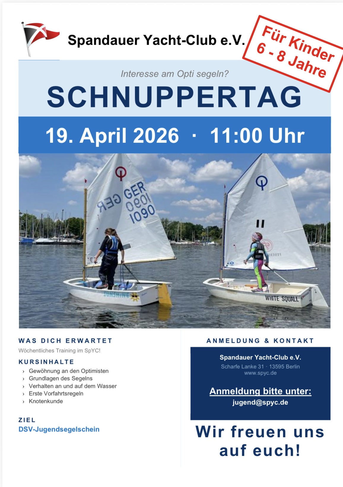 Willkommen imAm 19. April ab 11 Uhr sind uns segelinteressierte Kinder im Alter von 6 bis 8 Jahren zu unserem beliebten Schnuppersegeltag herzlich Willkommen - und die dazugehörige Familie natürlich auch! Hier gibt es alle relevanten Infos über unser Kinder- und Jugendtraining und vor allem den Einstieg in die Optimisten-Bootsklasse. Siehe beigefügten Flyer!